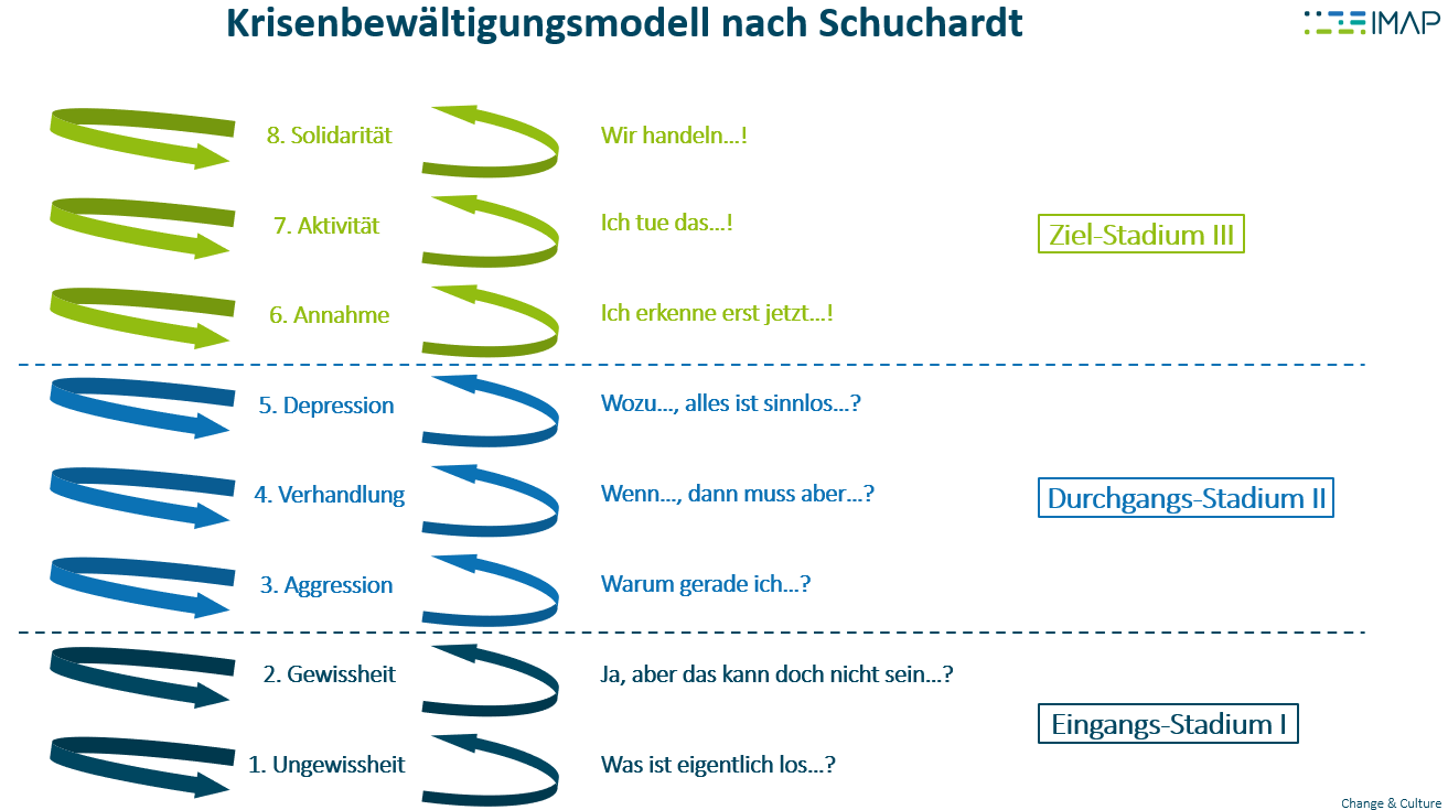 Dazu möchten wir Ihnen das Krisenbewältigungsmodell nach E. Schuchhardt, Professorin für Bildungsforschung und Erwachsenenbildung an der Leibnitz Universität in Hannover, vorstellen. Ihr Spiralmodell der Trauer- und Krisenbewältigung fußt auf Untersuchungen von mehr als 2000 Krisenbiografien. Es besteht aus drei Stadien mit insgesamt acht Phasen (Bild oben):