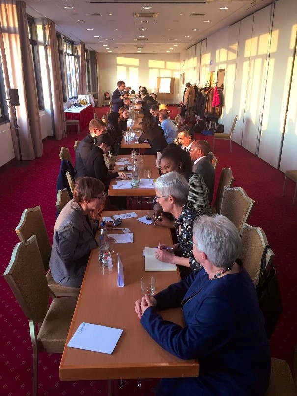 Am 26.2.2019 trafen in Berlin im Rahmen einer sogenannten „Dialogreise“ sieben Migrantendachorganisationen auf Bundesebene mit Vertreterinnen und Vertretern verschiedener Bundesministerien und der Bundesarbeitsgemeinschaft Freie Wohlfahrtspflege zusammen. Das gemeinsame Ziel war es, auszuloten, wo es Chancen und Möglichkeiten für eine vertiefte Zusammenarbeit geben kann. Im Rahmen des Begleitvorhabens der Strukturförderung durch IMAP, Kienbaum und die Kommunikationsexpertin Prasanna Oommen hatten sich die Geschäftsführungen und Vorstände intensiv auf ein „Speeddating“ vorbereitet und präsentierten überzeugend ihre Alleinstellungsmerkmale und Themenportfolios. Ins Gespräch vertieft erläutern die Verbände und die Ministerien einander die jeweiligen Interessen und Anknüpfungspunkte. Alle zehn Minuten ertönt ein Gong, der eine weitere Rotationsrunde startet. Neue Gesprächspartner/innen schütteln Hände, tauschen Visitenkarten aus und beginnen ihre Kurzverabredung.